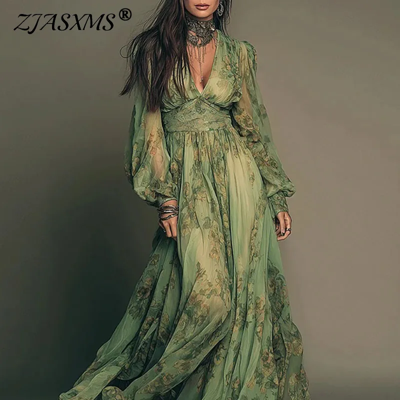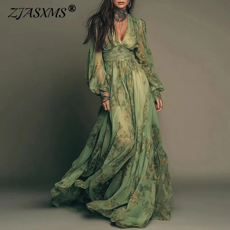 Nouvelle Robe Longue Maxi Bohème d'Été en Mousseline Imprimée Florale Verte Élégante, Col en V Profond Sexy, Taille Haute, pour le Printemps et la Plage