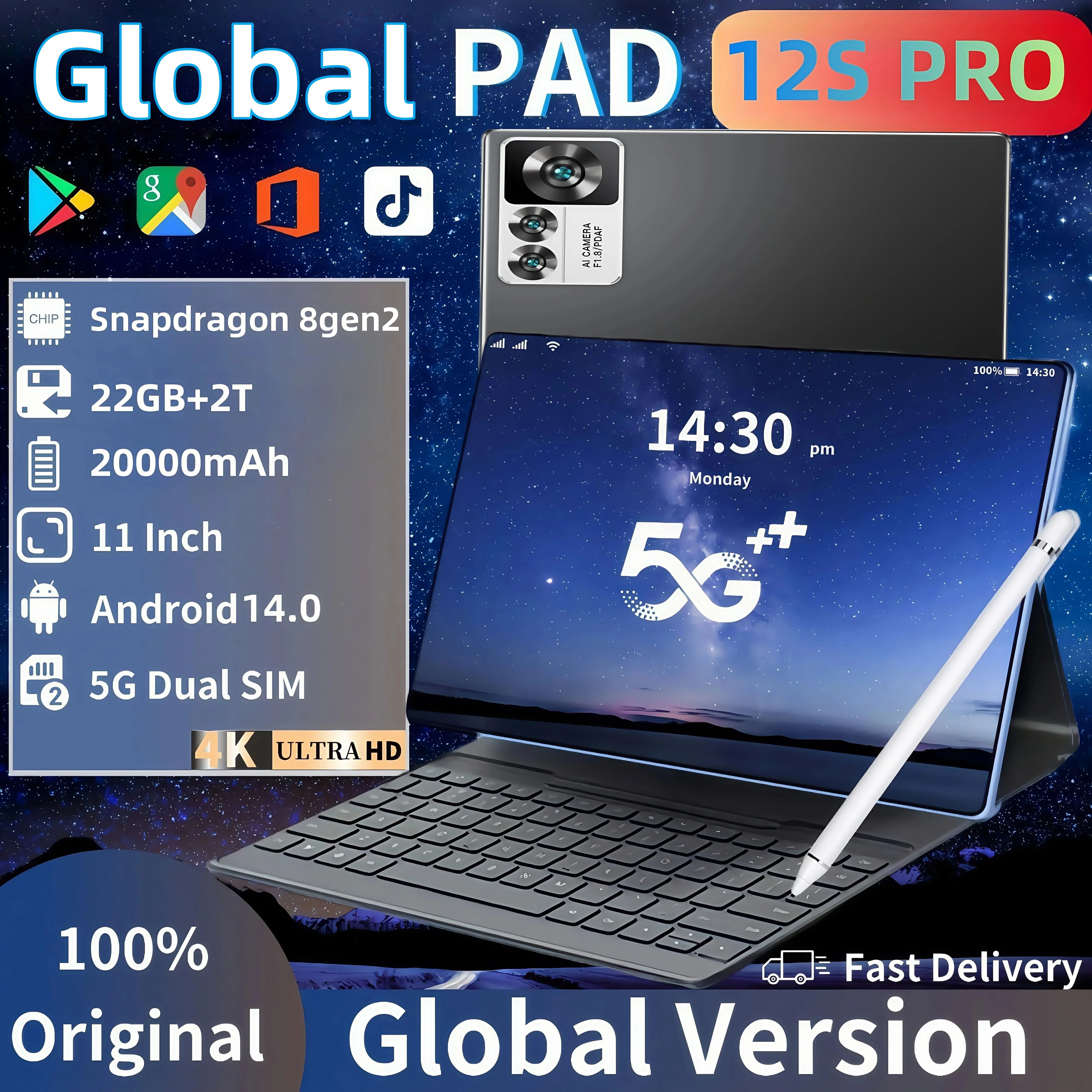 2025 nouvelle tablette originale Pad 12S Pro 22GB + 2T 11 pouces HD 4K Android14 20000mAh 5G double SIM appel téléphonique WiFi GPS WPS tablette PC