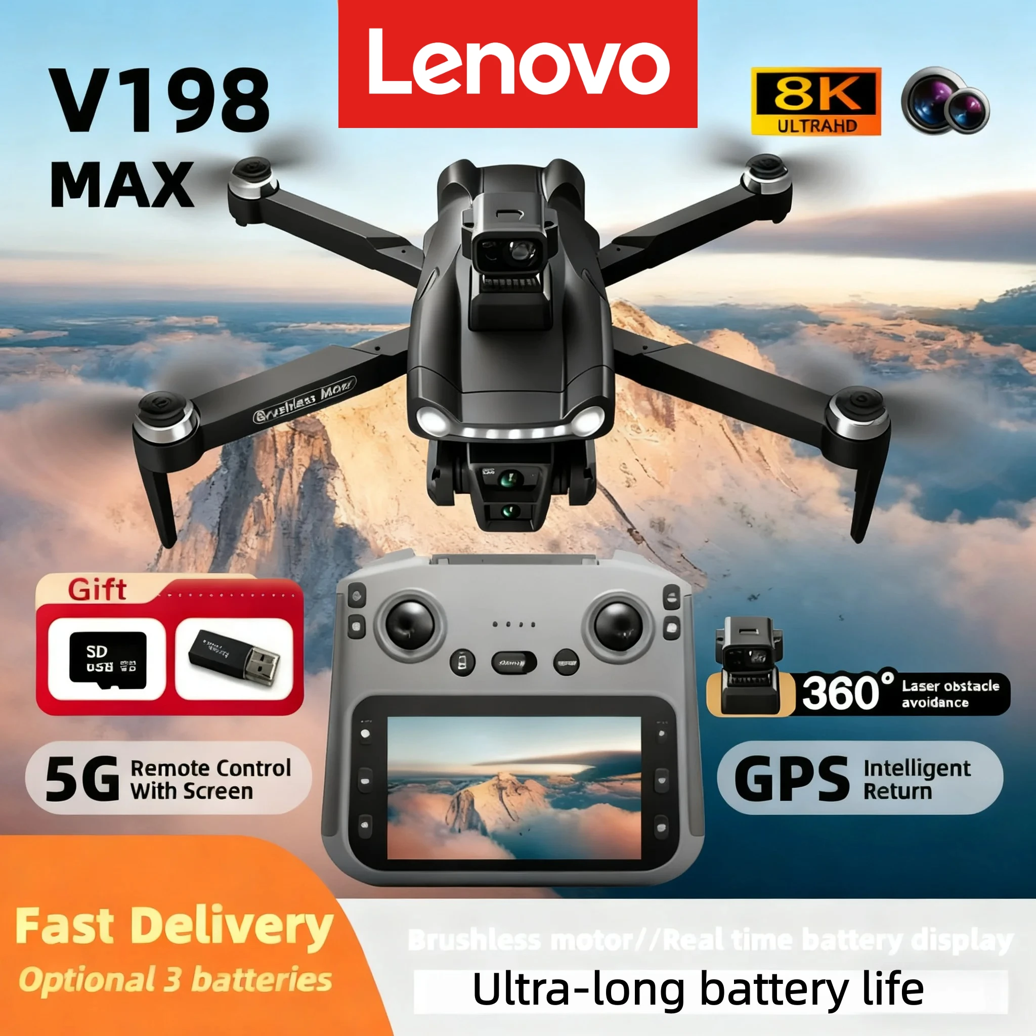 Drone de retour GPS Lenovo V198MAX 5G 8K HD avec double caméra, télécommande avec écran, évitement d'obstacles laser, jouets RC, cadeaux FPV