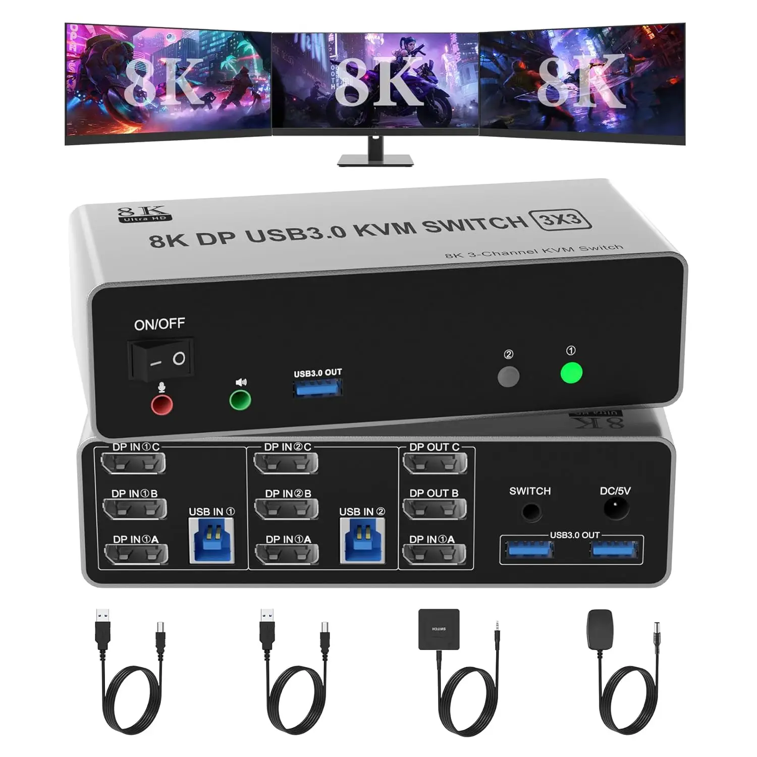 Commutateur KVM 8K @ 60Hz 3 moniteurs 2 ordinateurs 4K @ 144Hz, commutateur KVM DP 1.4 Displayport Triple moniteur pour 2 ordinateurs partage 3 moniteurs,