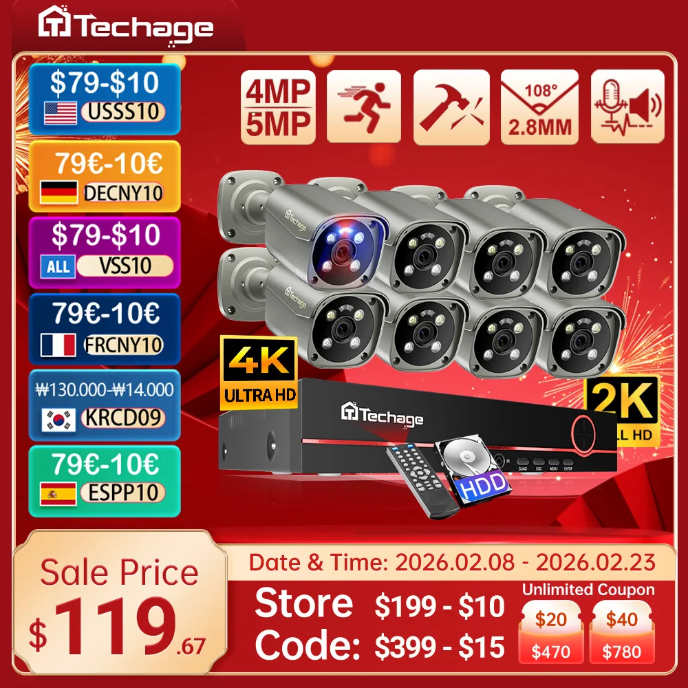 Techage-Système de caméra AI POE H.disparates, détection de visage, vidéo CCTV, kits de surveillance de sécurité, document complet, vision nocturne, 8CH, 5MP, 8MP, 4K