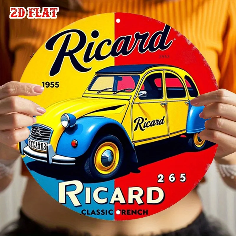 Panneau mural rond en métal 2D plat, style vintage Ricard, en aluminium, avec design classique jaune et bleu, décoration rustique pour garage