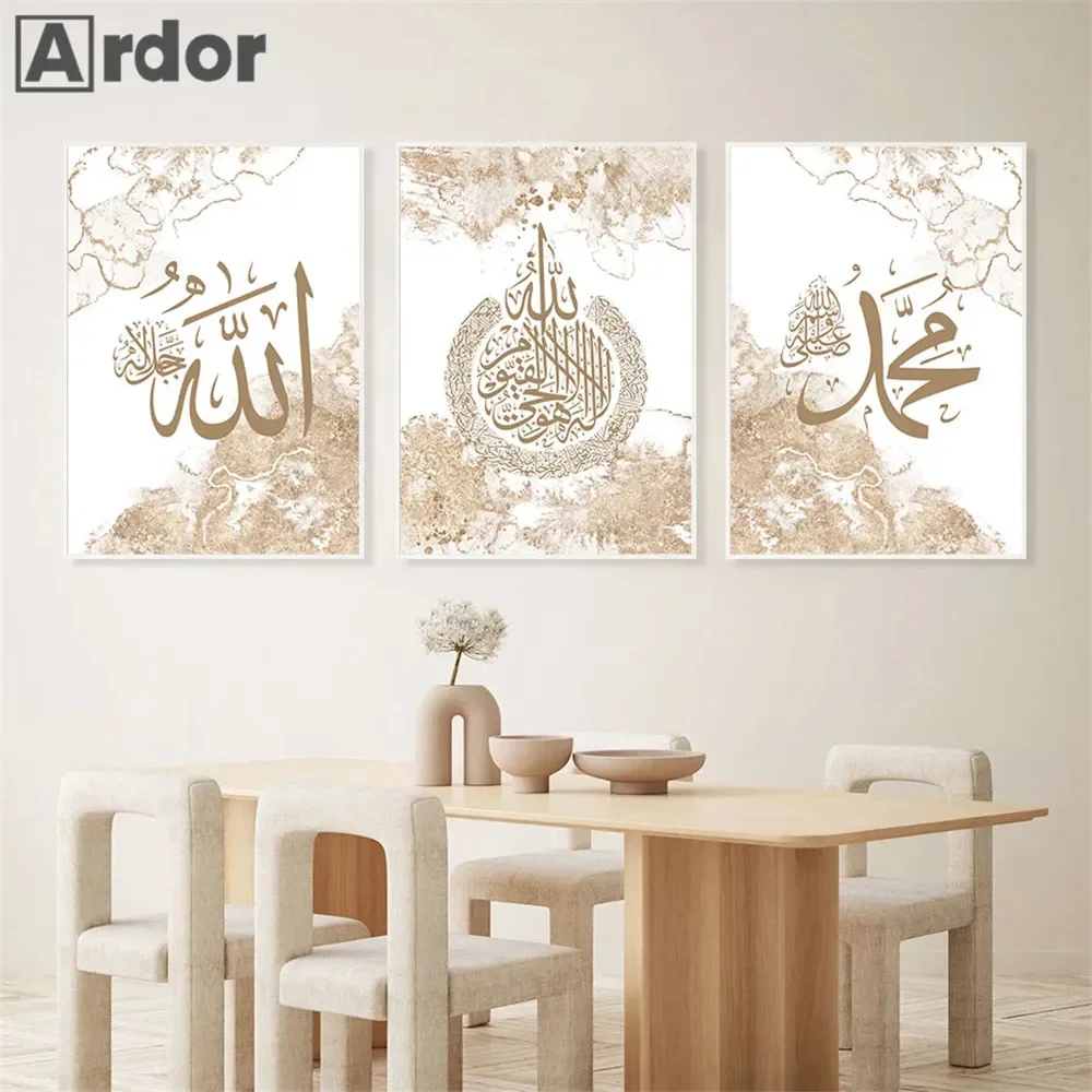 Ensemble d'art mural en toile de calligraphie islamique, 3 pièces, affiches abstraites dorées polyvalentes avec script arabe Allah, adaptées à la maison et au bureau