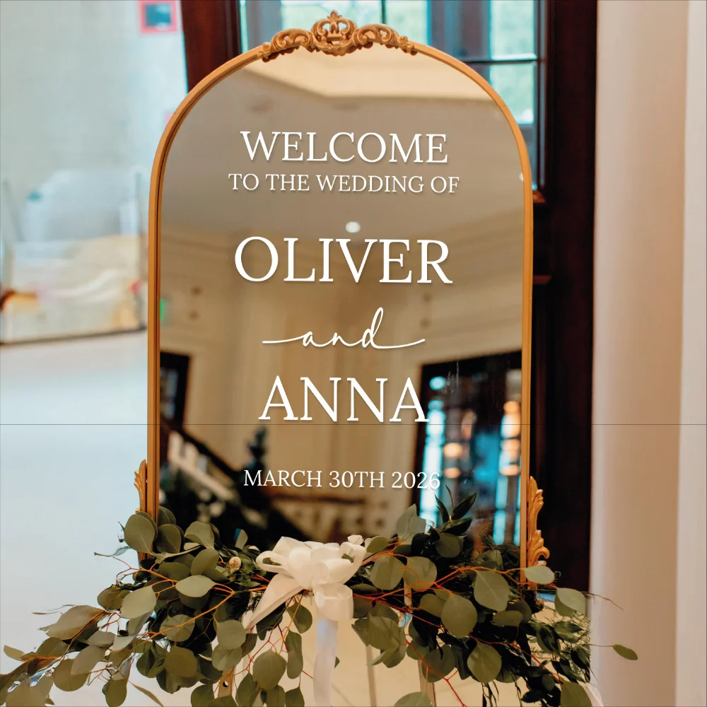 Autocollant de signe de mariage personnalisé, bienvenue à notre décalcomanie pour miroir, décor en vinyle élégant pour réception ou cérémonie, texte en feuille d'or
