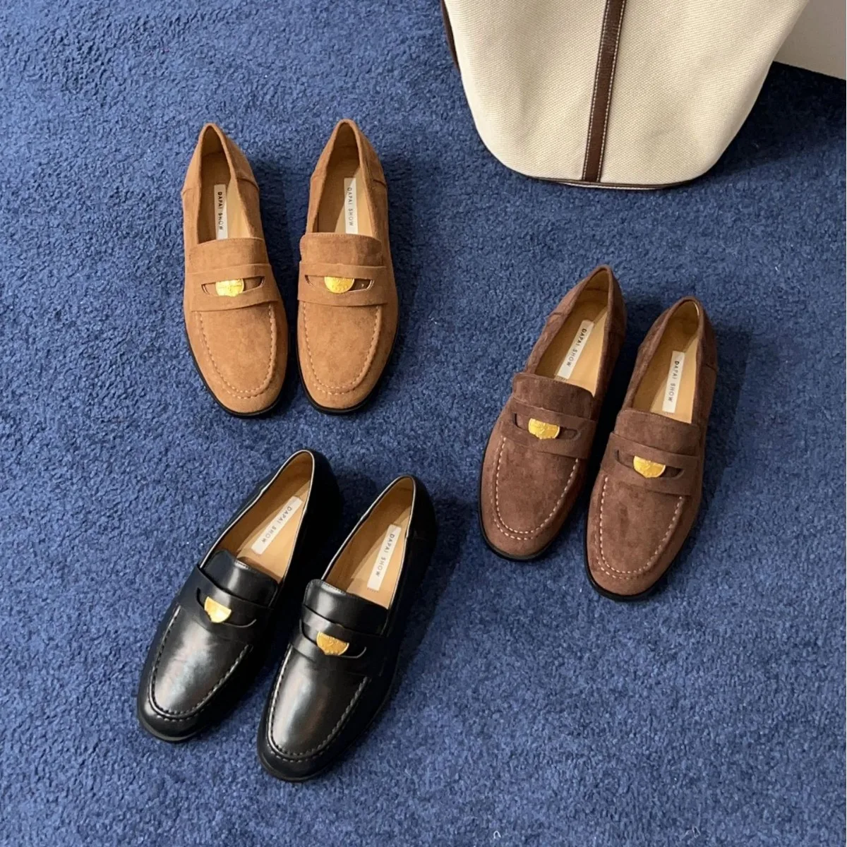 Mocassin classique à crête en cuir noir | Luxueux dessus en daim de couleur unie | Détail de charme de pièce de monnaie Signature | Semelle en caoutchouc durable
