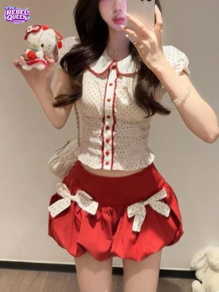 Ensemble 2 pièces chic japonais Sweet Prairie pour femme : haut slim à pois avec col Claudine + jupe tulipe rouge à nœud, tenue vintage élégante Y2K