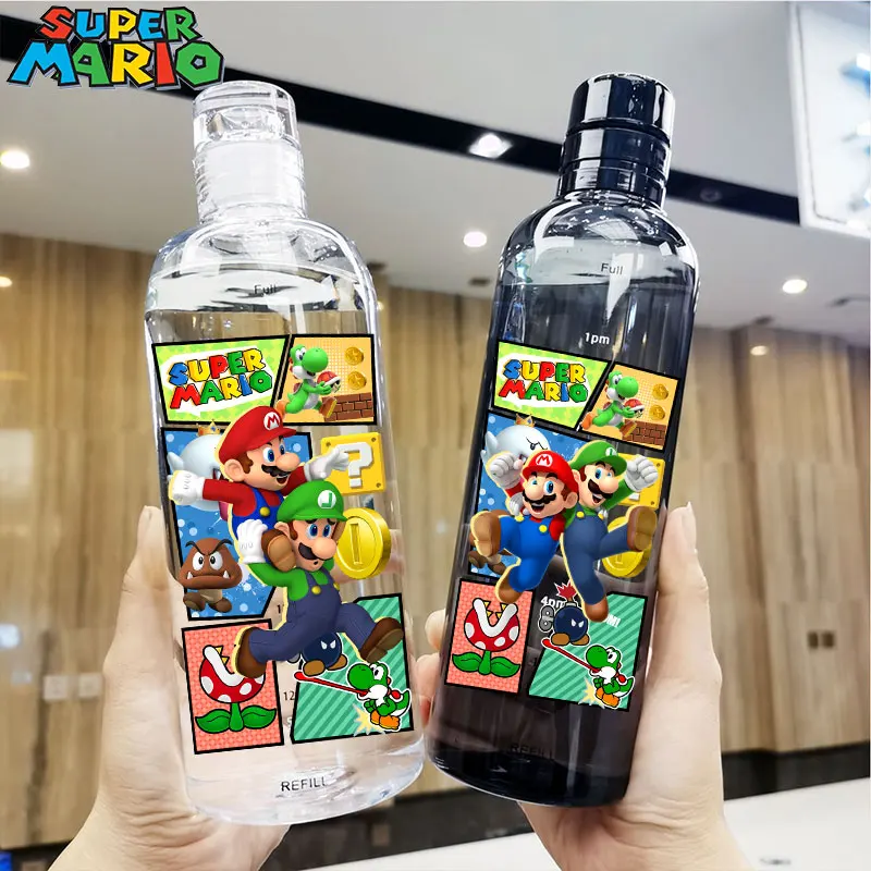 Bouteille d'eau portable transparente en plastique 500ml/750ml pour Mario Bros, motif dessin animé, noire et blanche, anti-chute, Super