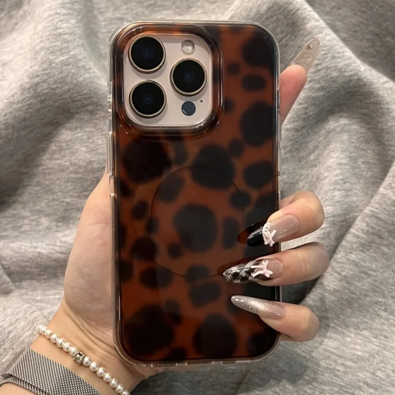 Coque de téléphone de luxe en ambre imprimé léopard magnétique, étui antichoc rétro pour iPhone 17Pro Max 17Pro 17 16 15 13 14 Pro Max