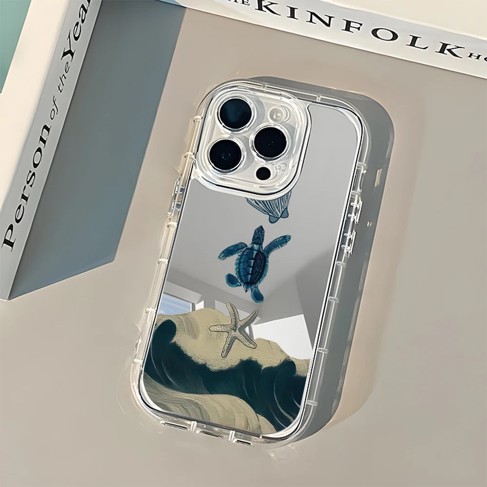 Coque de téléphone Éléments Marins Tortue pour iPhone 11 12 13 14 15 16 17 Pro Max 16E 17E 7 8 Plus XR X XS Max, Coque Arrière Miroir Tendance