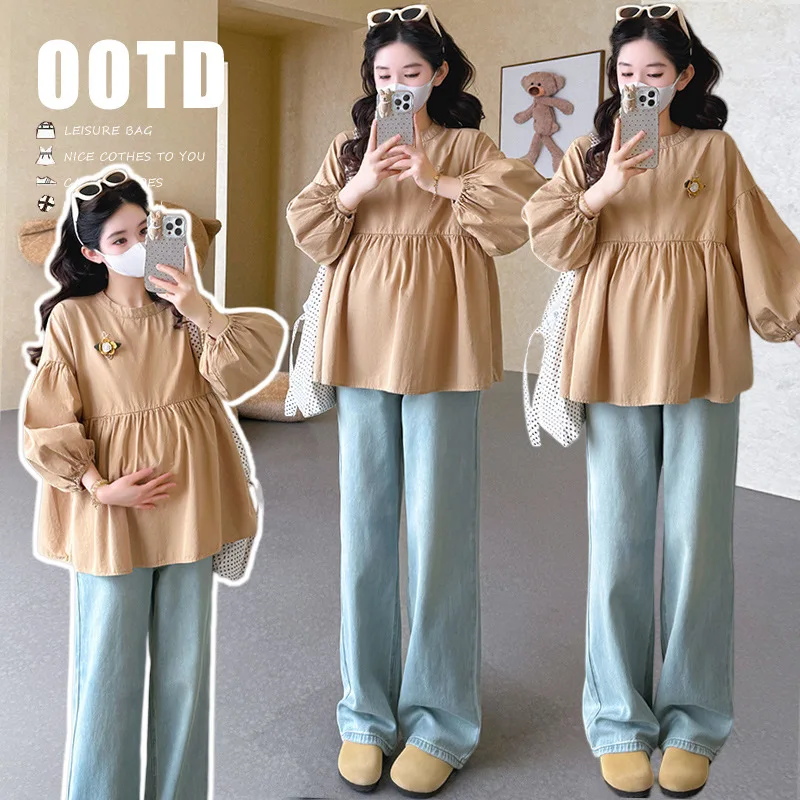 Kismama felső 2025 Ősz Új Koreai stílusú Ingó- Sokoldalú Minimalista aranyos Lámpás Ingujj babydoll Blúz mid Hossz shirts