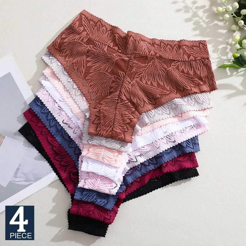 FINETOO 4db Virág- csipkével thongs sexi Átnézet g-string mid derékon t-back Anyaállat Lélegezhető intimates Brazíliai underwears