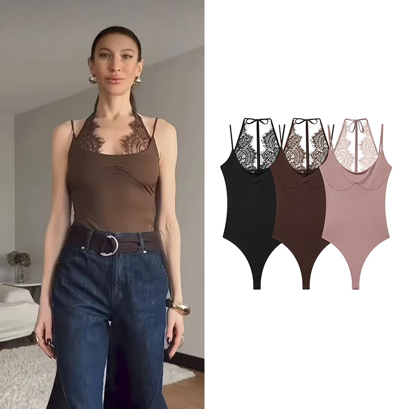 Női szögletes nyakú csipkével bodysuit Ujjatlan Spagetti szíj kezeslábas tömör színben bodycon Rugdalózó Ciszterna tops