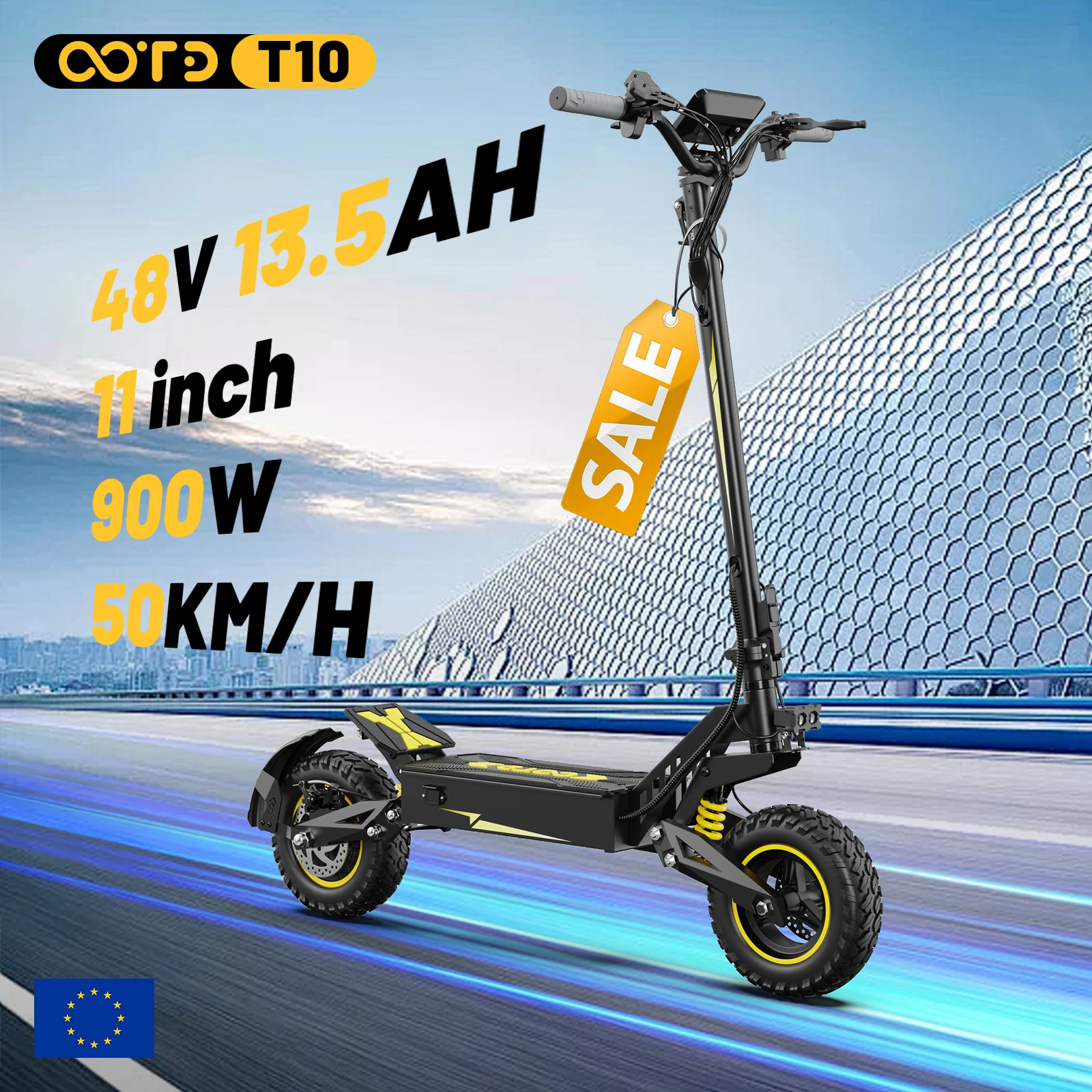 11in Ingázó Elektromos Motorroller OOTD T10 900W Hatalmas 48V 13.5/18ah Akkumulátor e-scooter számára Felnőtt 55KM/H sebesség 60KM Lőtér