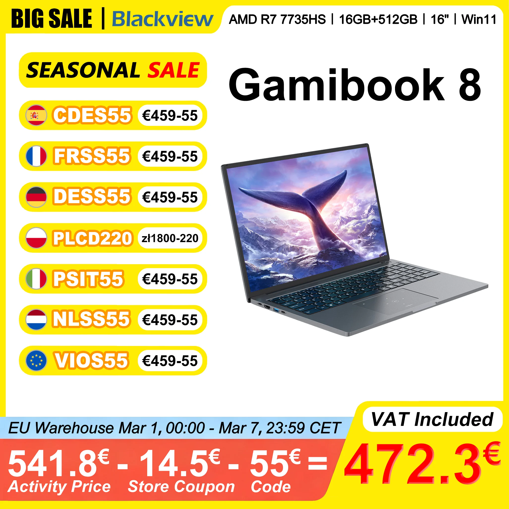 Blackview gamibook 8 Notebook 16" AMD R7 7735HS LPDDR5 16GB/32GB Belésüpped 512GB/1TB ROM Üvegezés 11 -ért BT5.2 wifi 6 backlit keyboad