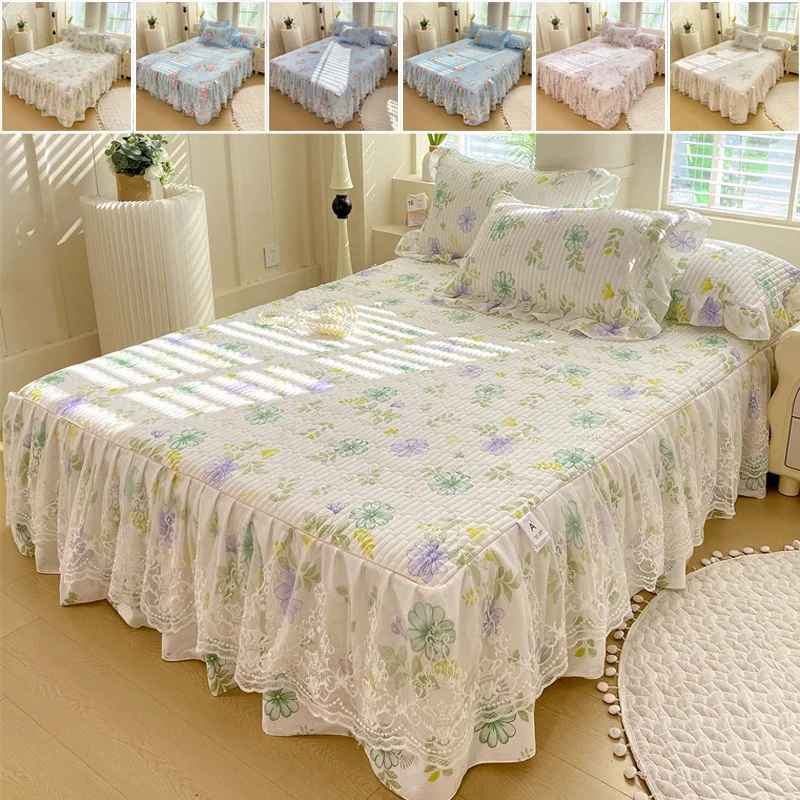 Quilted Nehéz felfogású Ágy Szoknya vel ruffles virágos Imprimé kelme Ágy Bútorhuzat vel csipkével single/queen/king méret haza Ágy Fehérnemű Árverseny 침대스커트