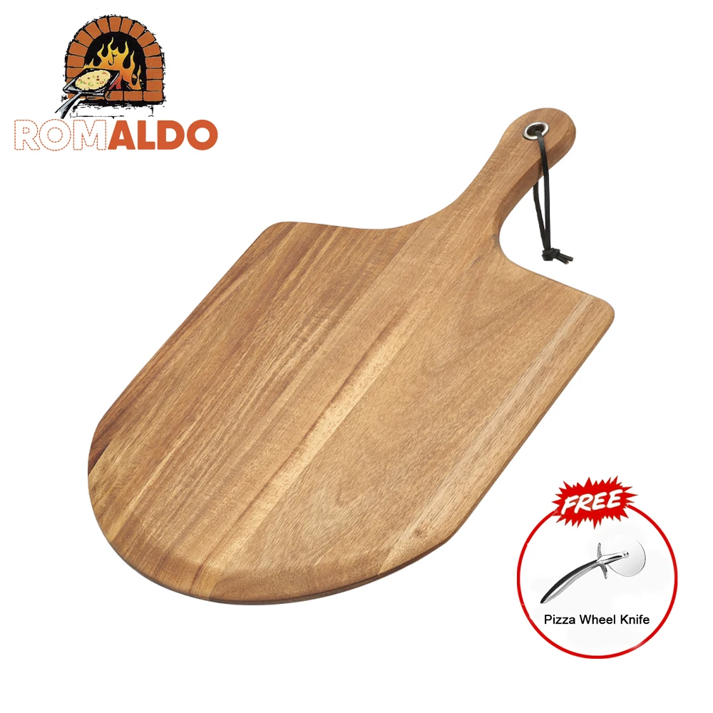 ROMALDO Tagliere per Pizza in Legno di Acacia da 12.6/13.4 Pollici con Comoda Impugnatura, Vassoio per Pizza Appendibile, Accessorio da Cucina per Forno