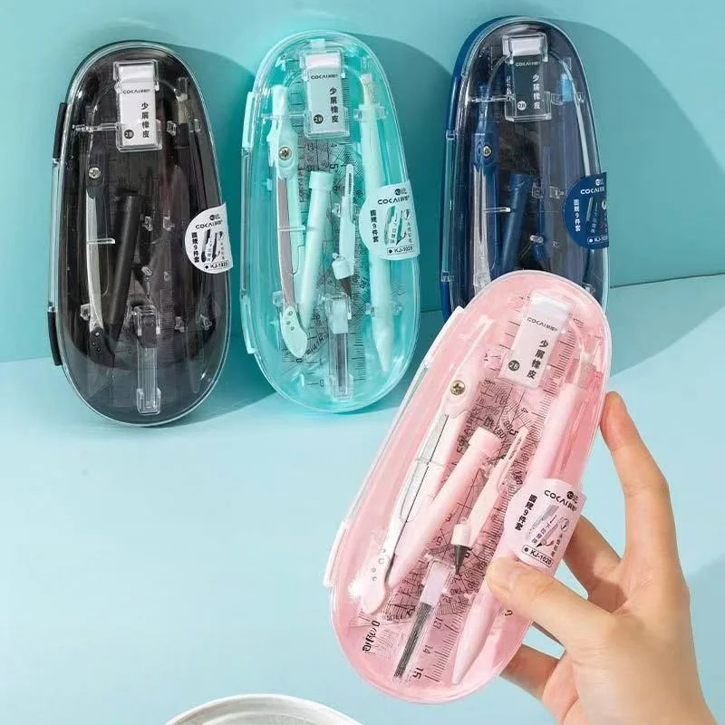 Un set di 9 bussole e righelli per la matematica Forniture di cancelleria per gli studenti delle scuole elementari all'inizio dell'anno scolastico