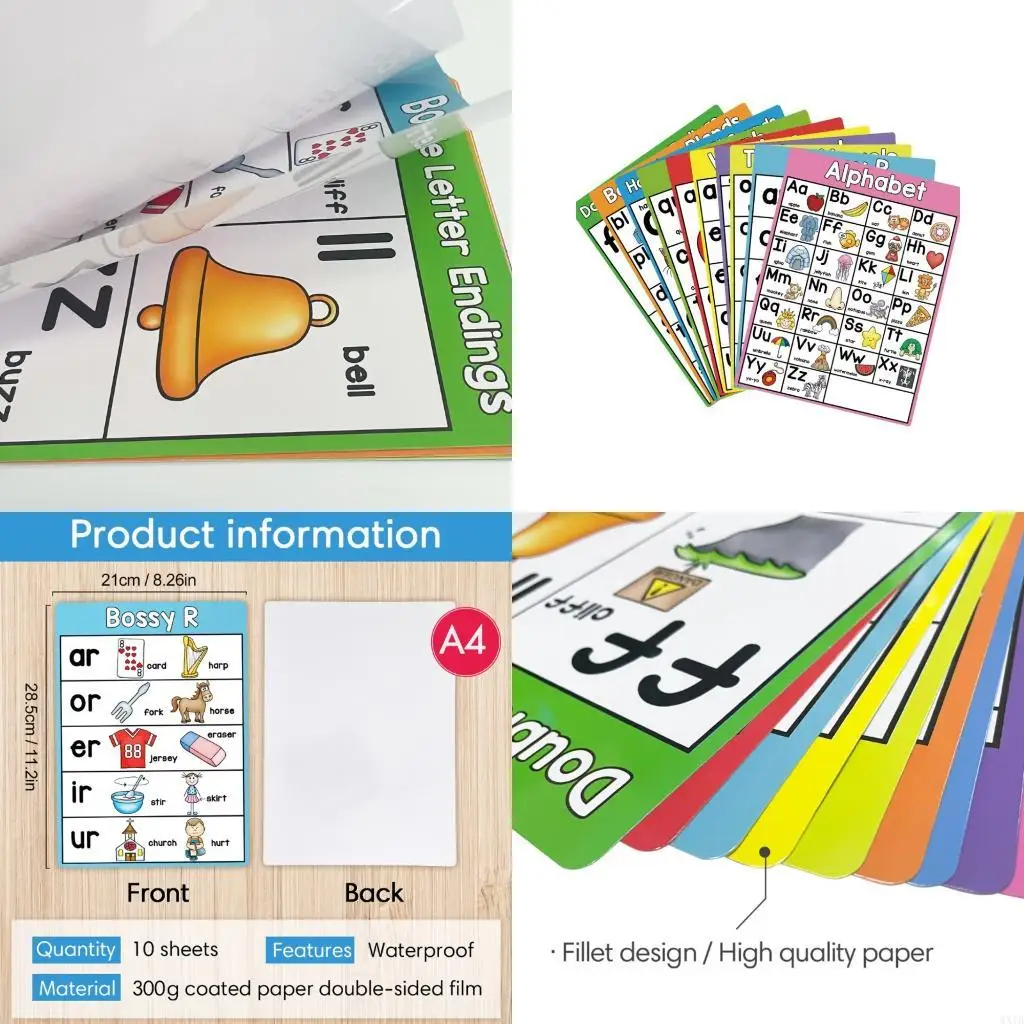 Set 10 poster fonetica inglese. Include vocali, suono morbido e duro, miscele iniziali, grafico per l'apprendimento delle
