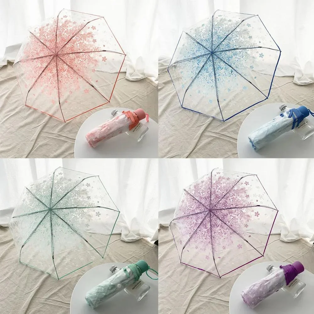 Ombrello Pieghevole Trasparente con Apertura/Chiusura Automatica/Manuale, Design Romantico con Fiori di Ciliegio, Ombrello Trasparente a Tre Sezioni.