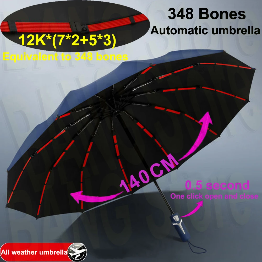 348 Bones Ombrello automatico super antivento Ombrello da uomo d'affari di grandi dimensioni Protezione UV Parasole da donna Ombrello per tutte le stagioni