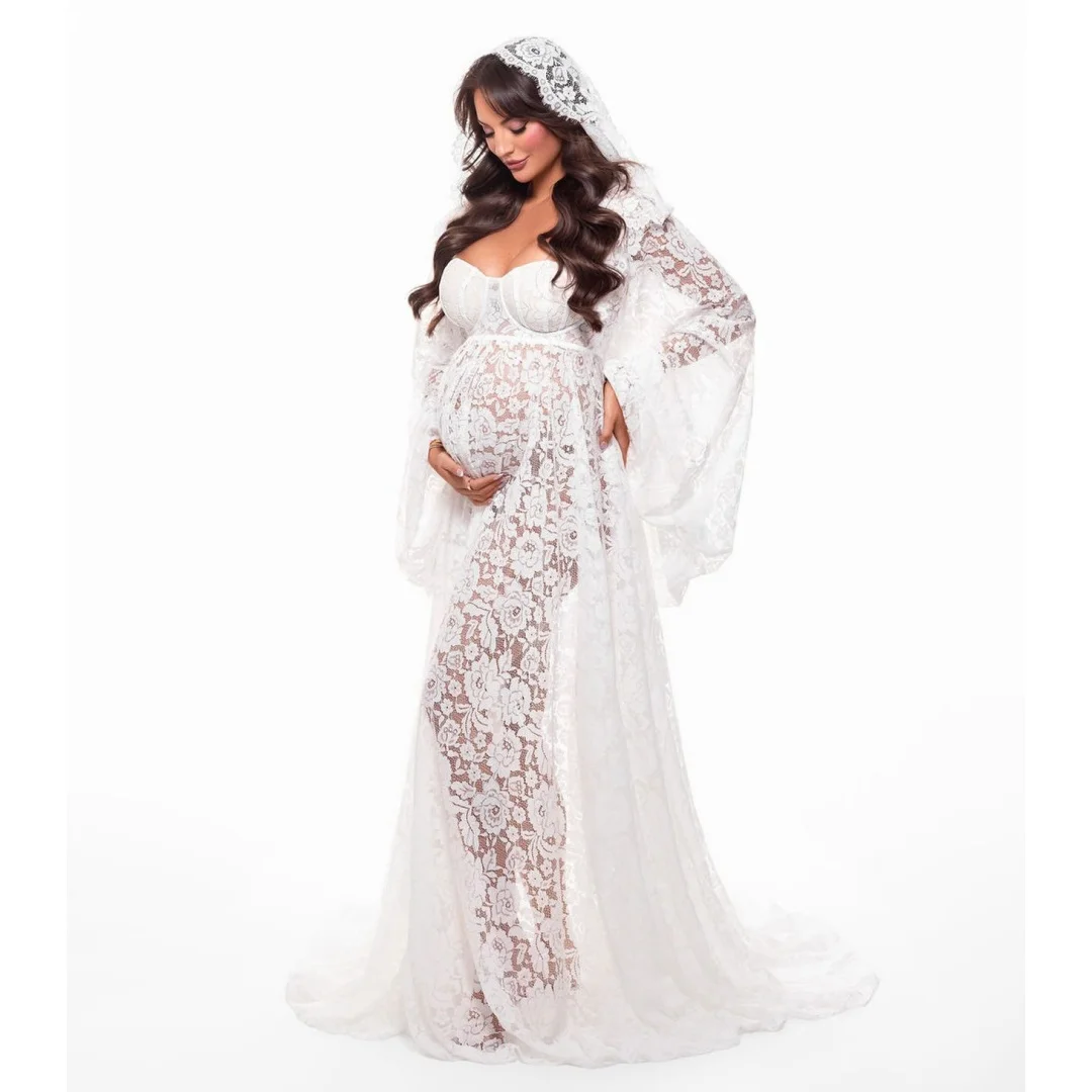 Abiti da ballo in pizzo bohémien con maniche lunghe trasparenti, vestito per servizio fotografico premaman, abiti raffinati per baby shower, personalizzabili