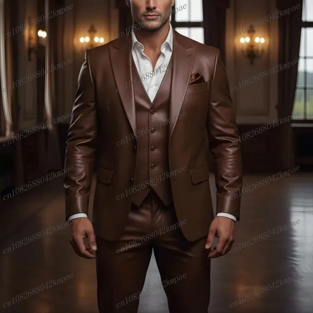 Completo da Uomo in Pelle Marrone Scuro, Abito Formale per Sposo, Testimone, Matrimonio, Festa, Cerimonia, Business, Smoking a 3 Pezzi: Blazer, Gilet e Pantaloni