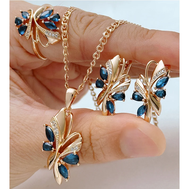 Kinel Hot Blue Zircone naturale Farfalla Anello Orecchini Collana per le donne Moda 585 Set di gioielli da sposa vintage color oro rosa