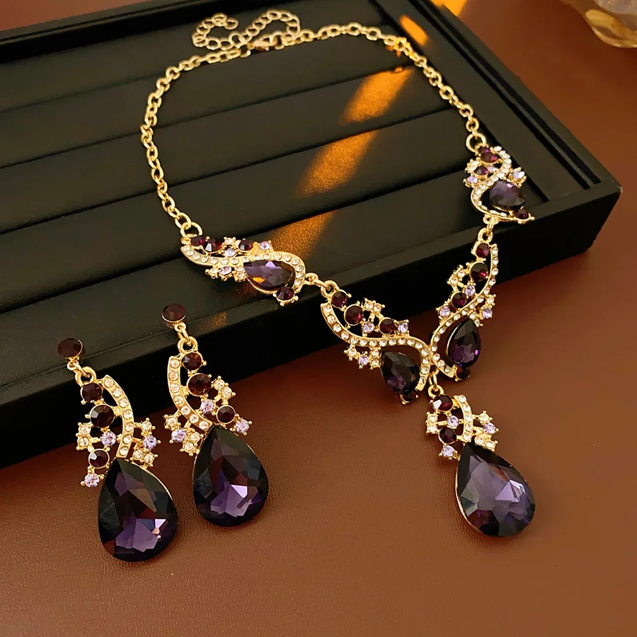 Set di Gioielli da Sposa con 2 Pezzi: Collana con Pendente a Goccia d'Acqua Viola con Strass e Orecchini in Stile Vintage da Palazzo per Donna, Ideale per Feste e Matrimoni