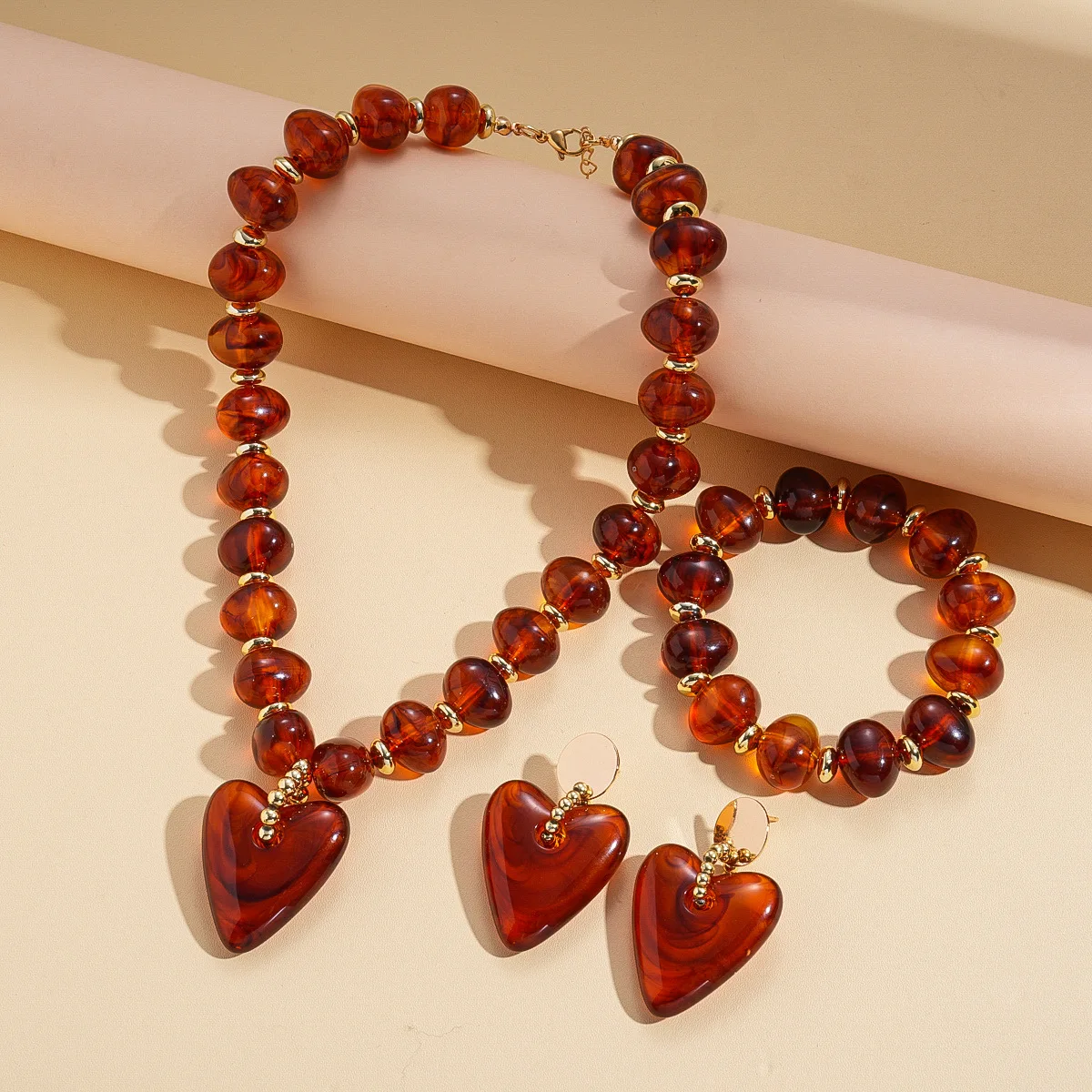 Collana con Ciondolo a Cuore e Perline in Acrilico Ovale Stile Europeo e Americano, Orecchini Eleganti alla Moda, Accessori da Donna per Banchetti K