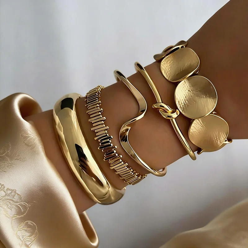 Set di 5 Bracciali Irregolari con Apertura, Gioielli Combinati, Bracciali a Strisce Esagerate, Stile Punk con Foglie, da Donna