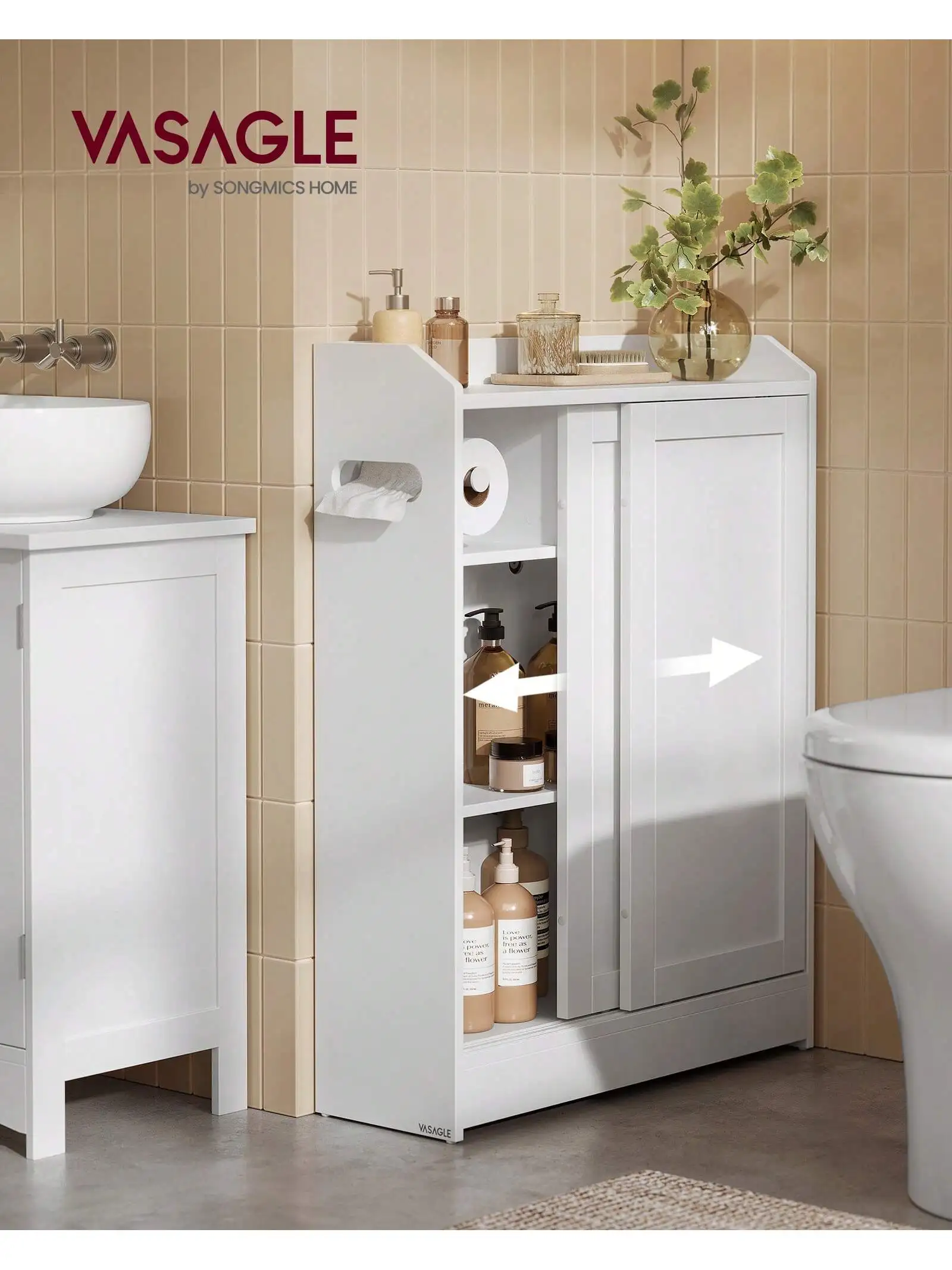 VASAGLE armadio da bagno stretto, porta carta igienica, vano spazzole, porte scorrevoli, 20x60x80 cm, bianco nuvola