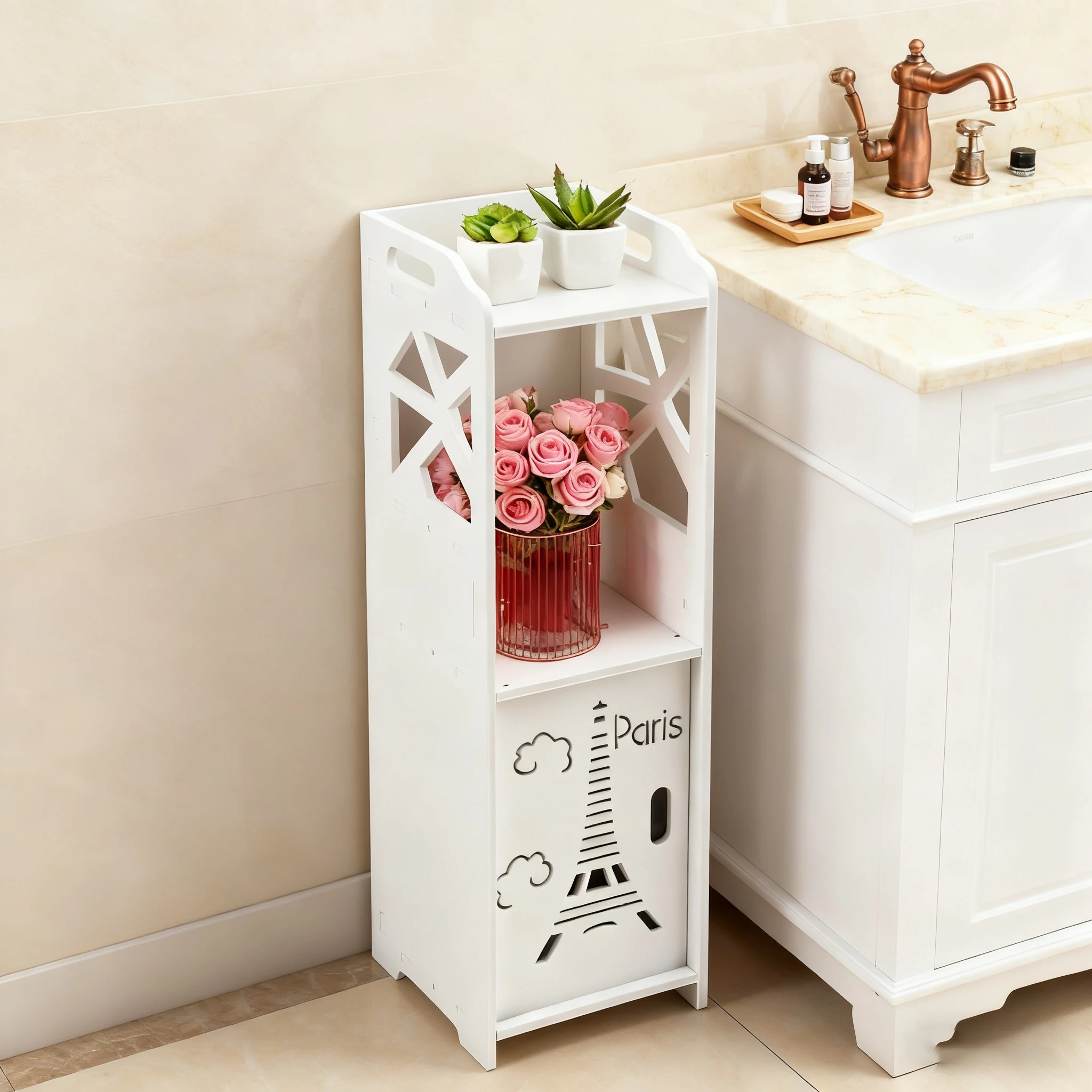Mobile da bagno con anta e porta carta igienica, materiale PVC, sottile, da terra, facile da montare, 80x15x17 cm