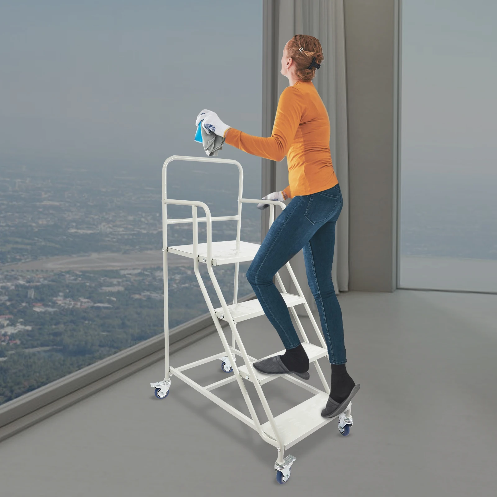 Scala da magazzino a 4 gradini con ruote, scala mobile industriale, capacità di carico pesante di 400 kg/881 libbre, sgabello robusto bianco