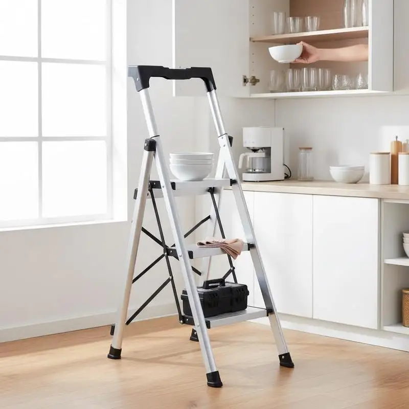 Sgabello Pieghevole con Capacità di Carico Massima di 150kg, Altezza Regolabile, Scala Portatile in Acciaio, Sgabello Antiscivolo Resistente per Cucina, Camera da Letto, Bagno