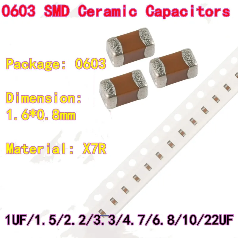 Condensatori ceramici SMD 0603 da 100 pezzi 1μF/1.5μF/2.2μF/3.3μF/4.7μF/6.8μF/10μF/22μF/33μF/47μF X7R 10% 10V 16V 25V 50V