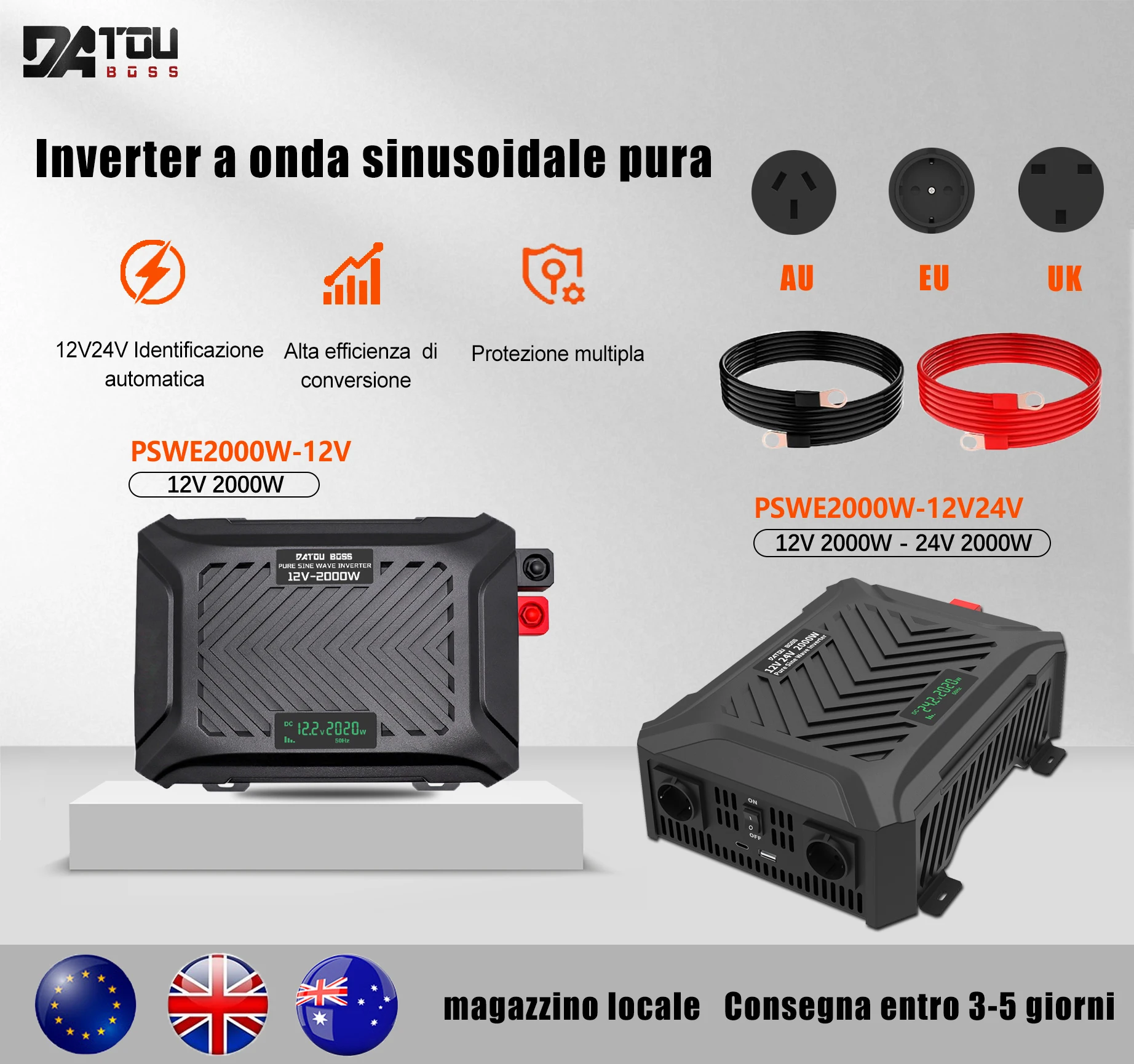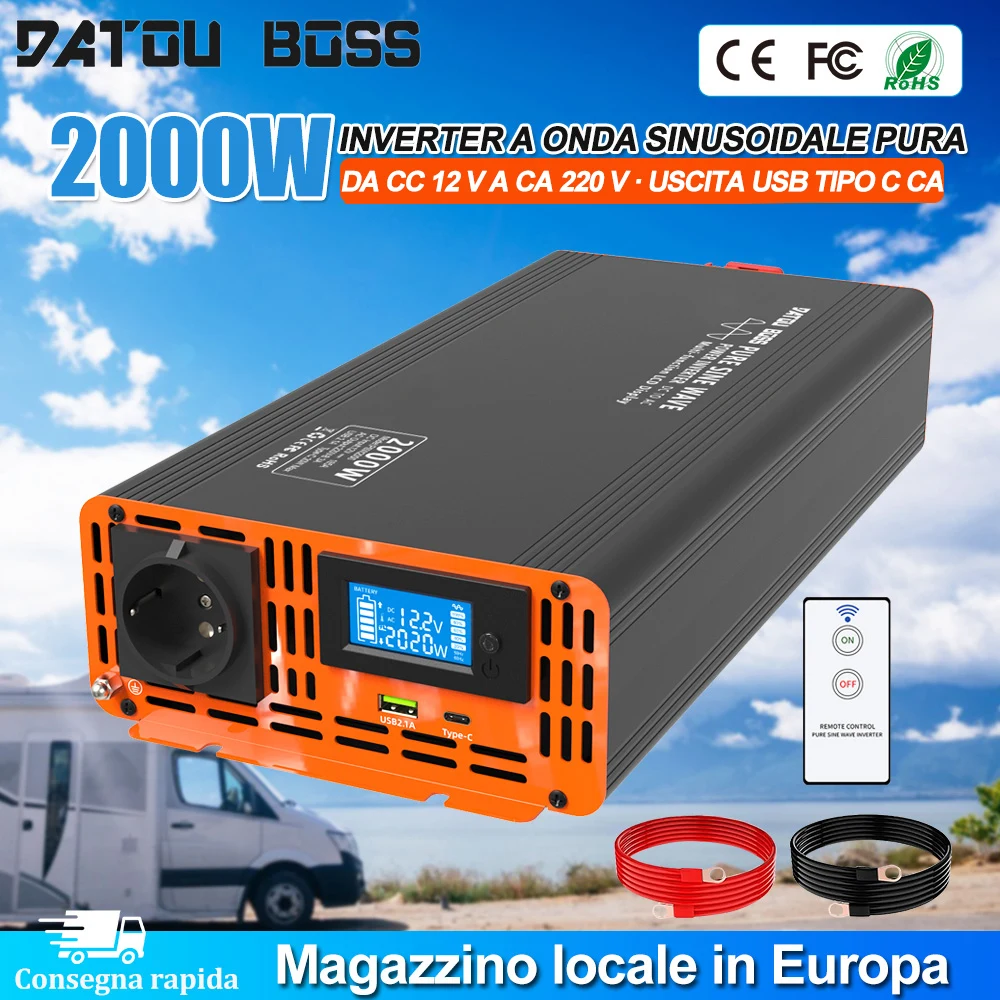 Inverter a onda sinusoidale pura DATOUBOSS da 2000 W, convertitore di tensione per accumulatore portatile da 12 V CC a 220 V CA, inverter per auto con USB tipo C LCD