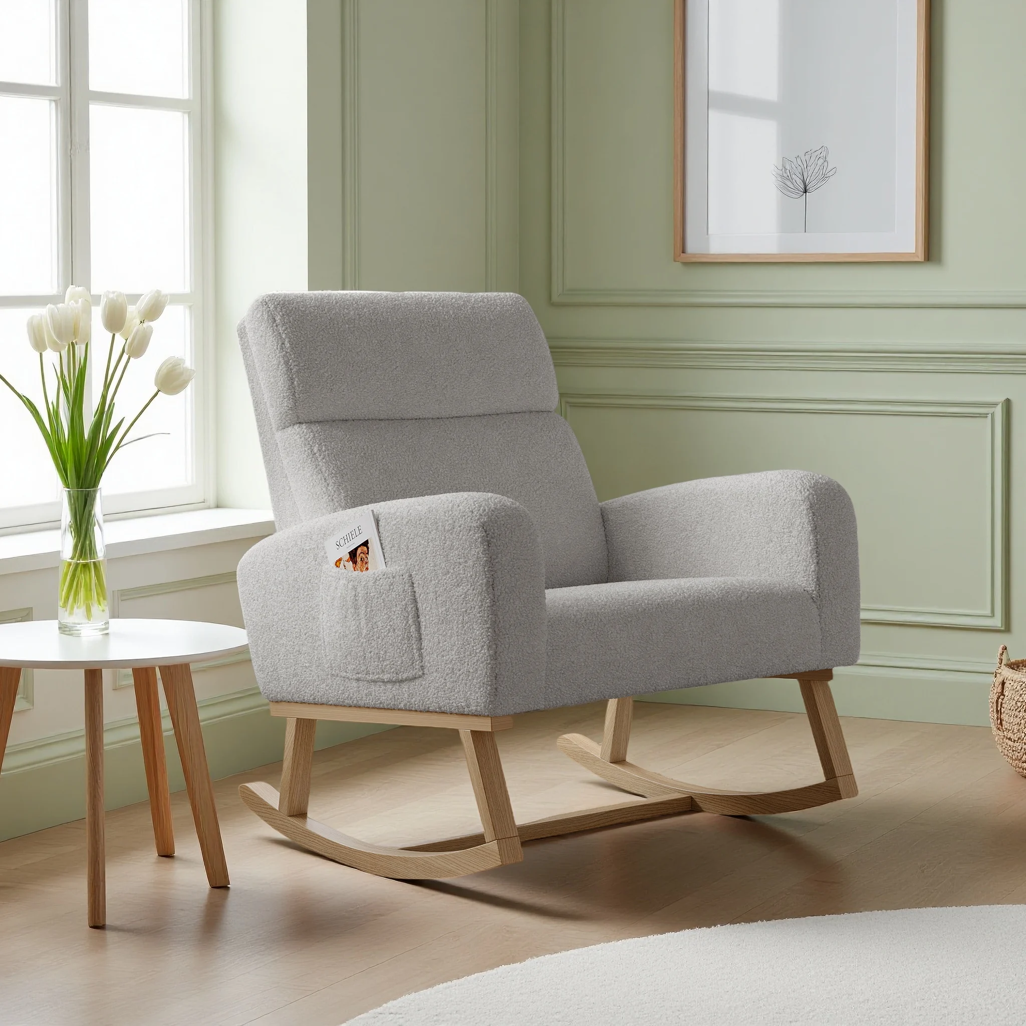 Sedia a Dondolo Comanlai con Gambe in Legno Massello, Poltrona Scandinava in Velluto Teddy per Soggiorno, Camera da Letto, Balcone
