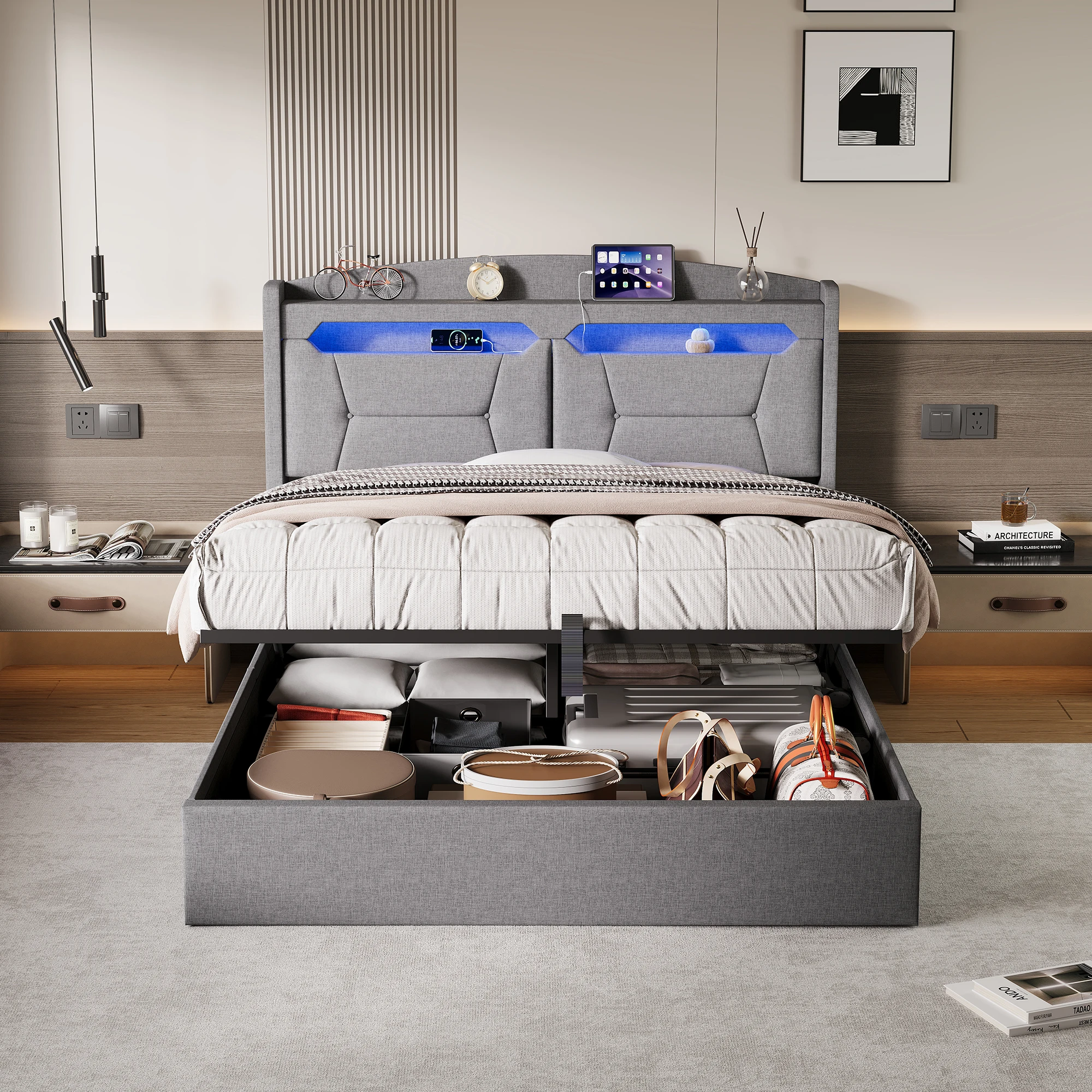Letto Imbottito 140x200 con Spazio di Archiviazione, Letto Matrimoniale con Illuminazione LED e USB, Struttura Letto con Testiera, Rete a Doghe, Lino