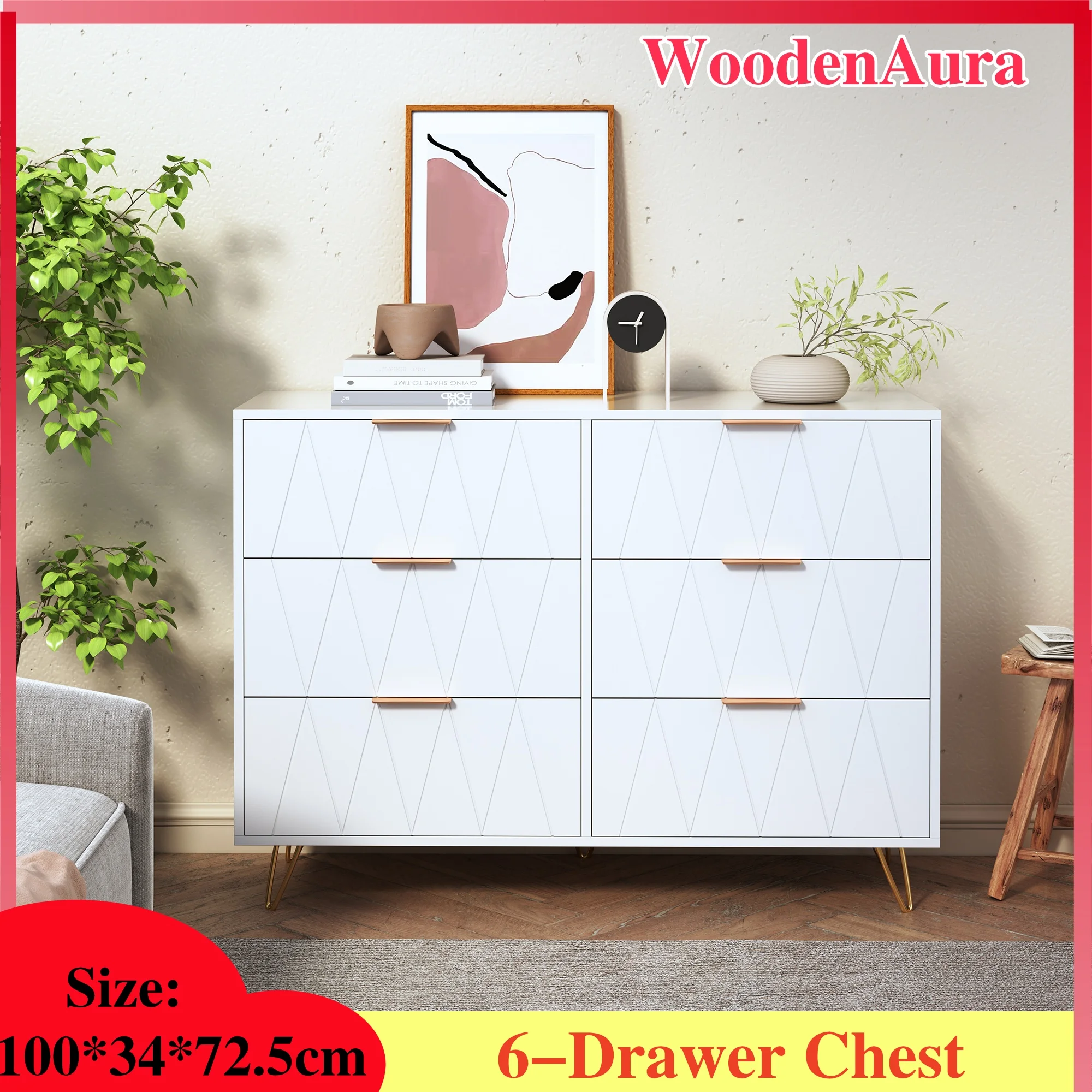 WOODENAURA Comò a sei cassetti, armadio, credenza, grande capacità, maniglie dorate, adatto per camere da letto, soggiorni, sale da pranzo, bianco