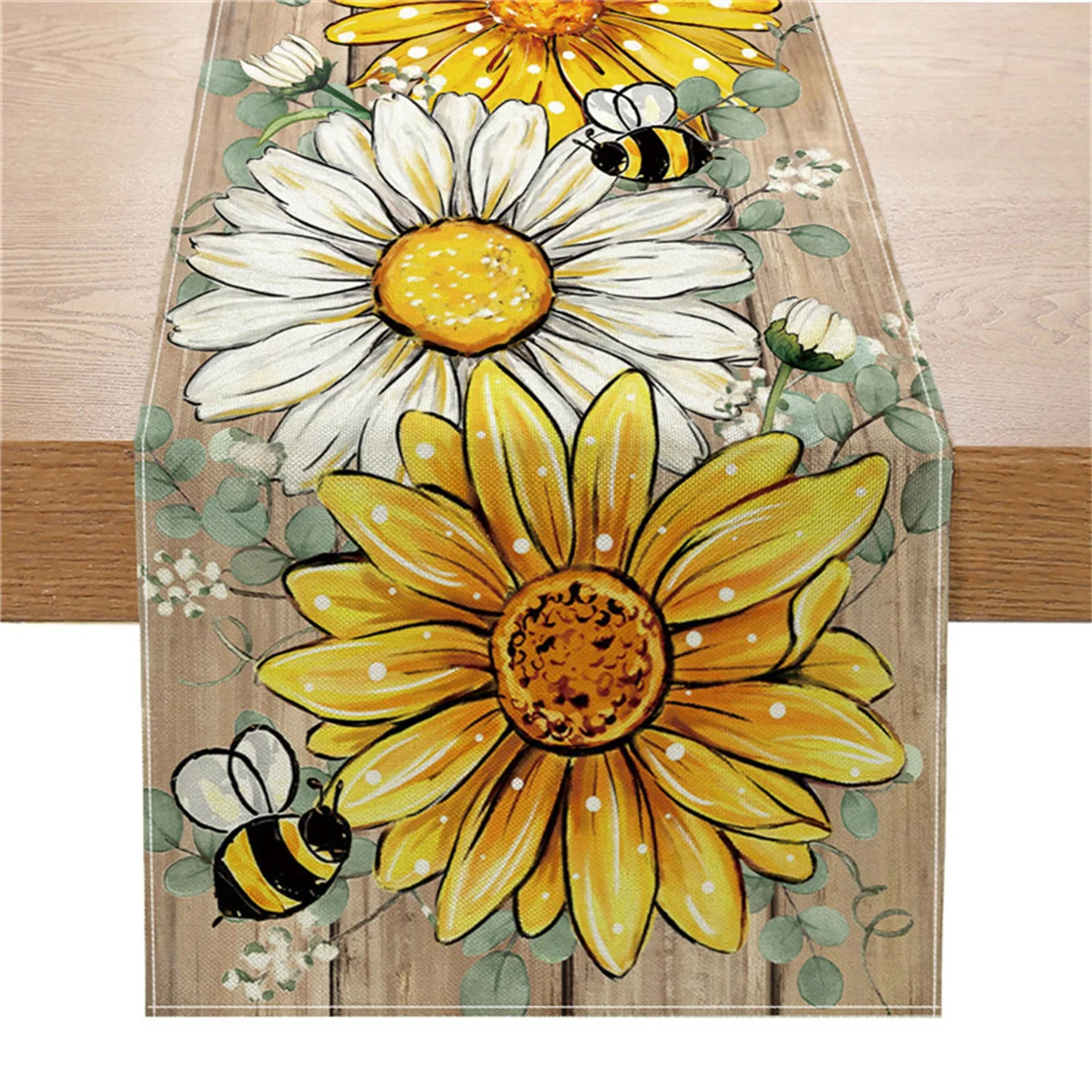 Runner da Tavola Rustico con Girasoli e Margherite, Decorazione Floreale e con Api per Tavoli Primaverili ed Estivi, per Cucina e Sala da Pranzo