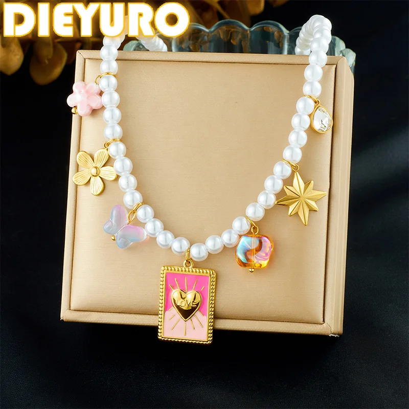 DIEYURO Acciaio inossidabile 316L quadrato dorato fiore stella ciondolo in cristallo rosa perla collana di perline regalo di gioielli con catena al collo da donna