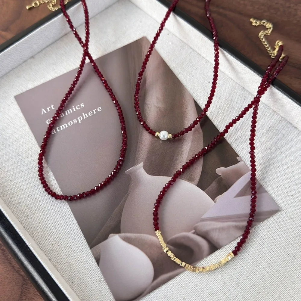 Nuovo Elegante Collana Girocollo Rosso Perla Nero Oro con Design di Nicchia e Perline di Vetro