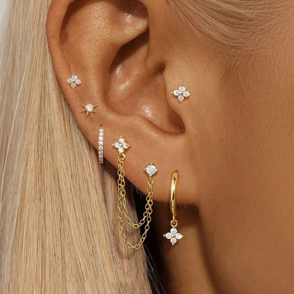6 pezzi moda zircone fiore catena orecchio stud ciondola cerchio Huggie orecchino set per le donne, stella stile orecchino piercing gioielli