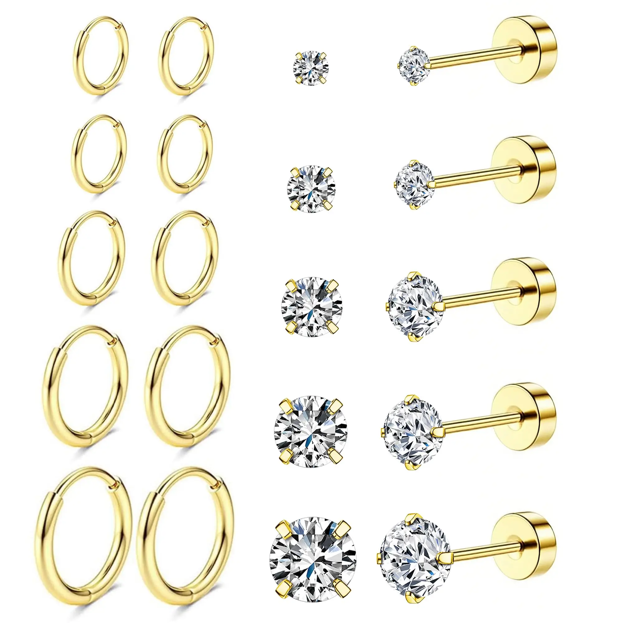 Set di 10 paia di orecchini da donna, orecchini a cartilagine per più piercing all'elica con retro piatto, piccolo cerchio per orecchio sensibile