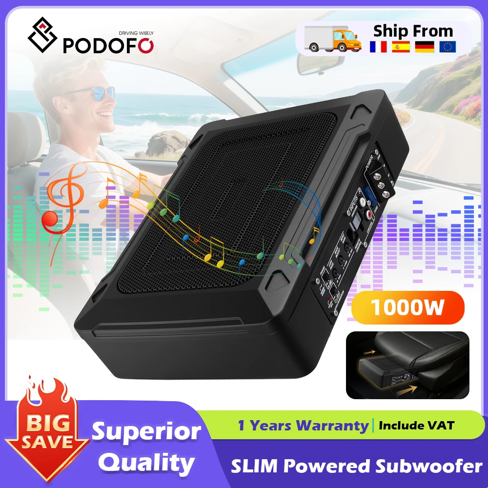 Podofo 1000W 1 Set Custodia per subwoofer sottile e cavo audio Subwoofer compatto incorporato AMP sotto il sedile per auto