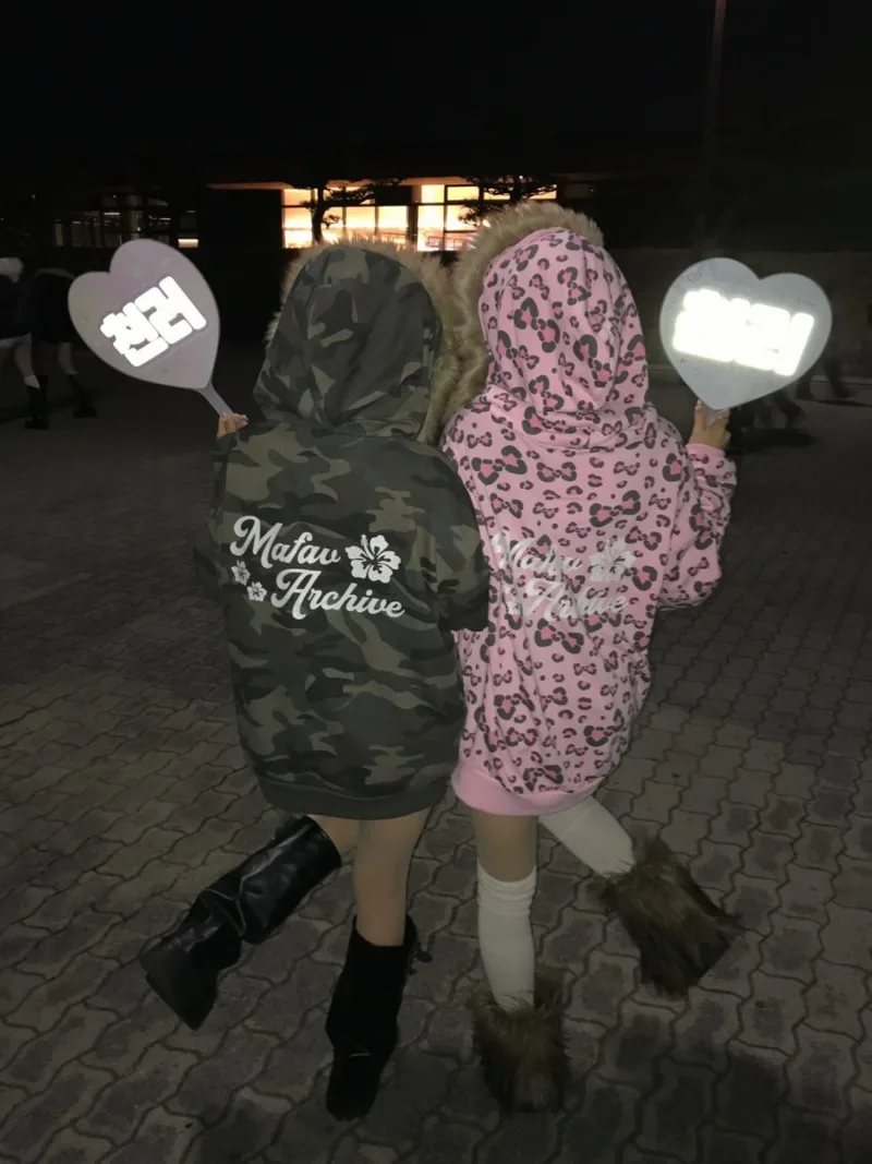 Felpa con Cappuccio Oversize da Donna Stile Hip-hop Americano, Stampa Leopardata, Y2k Harajuku, Trendy, con Cerniera, Retro Casual