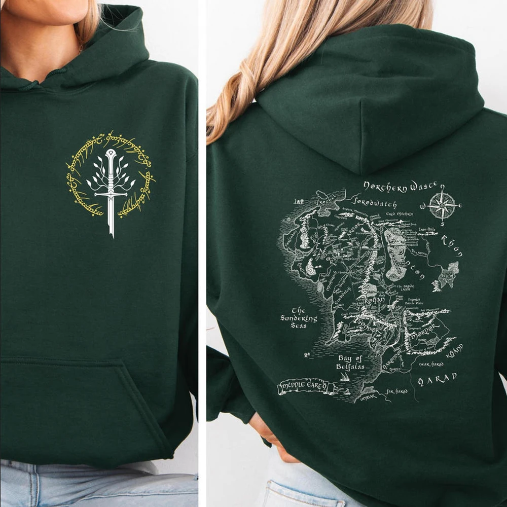 Felpa con Cappuccio Mappa della Terra di Mezzo Second Breakfast Club LOTR, Maglione per Fan della Terra di Mezzo, Abbigliamento Tolkien, Maglietta The Shire, Felpe con Cappuccio del Film LOTR