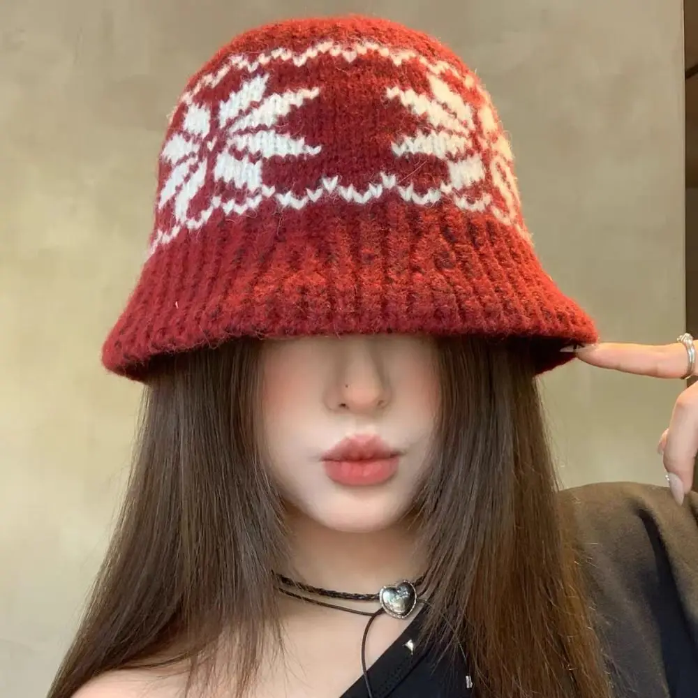 Moda calda fiocco di neve jacquard cappello lavorato a maglia stampato lana jacquard modello berretti coreano carino stampa berretto lavorato a maglia autunno