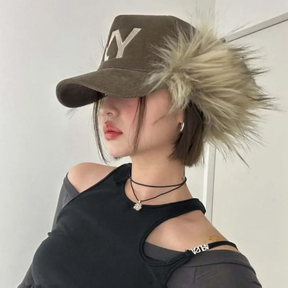 Berretto da baseball in velluto a coste stile coreano retrò ricamato cappello da baseball con piume calde imitazione pelliccia parasole Y2k berretto con visiera quotidiano