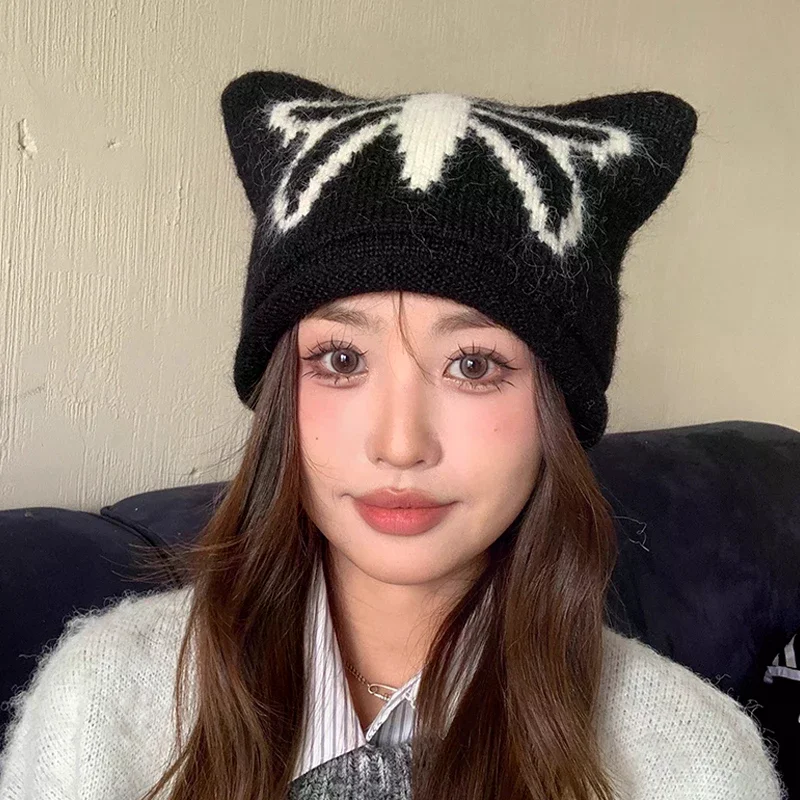 Autunno e inverno nuovo simpatico cappello di lana lavorato a maglia con orecchie di gatto protezione per le orecchie calda da donna